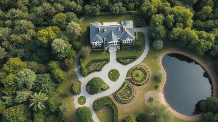- Landscaping features rooted in the ground, including trees and shrubs